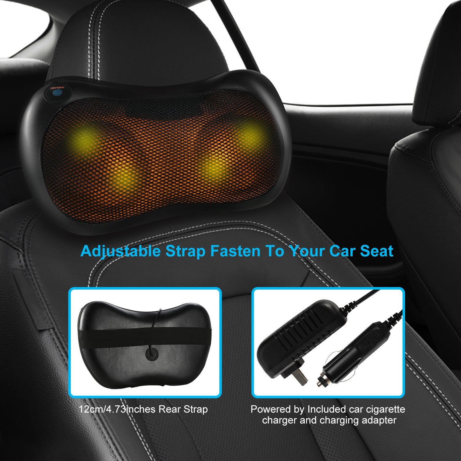 **Easy Operation and Flexible Rear Strap*:Powered by charging adapter or cigarette car charger,turn on/off and modes switch can be achieved via one button operation. Equipped with a 32cm/12.60inches flexible strap,you can fasten it to your car seat chair or home chair.