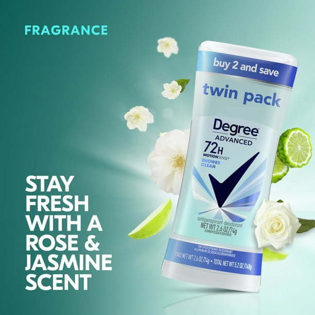 Degree Advanced Shower Clean Antiperspirant Deodorant lets you face the day with confidence. This antiperspirant for women features 72-hour sweat and odor protection and the clean floral scent of rose and jasmine, blended with delicate fruit, for an invigorating, clean feeling. Only Degree has MotionSense® technology that moves in sync with your body. This antiperspirant deodorant releases a burst of subtle fragrance every time you move, for nonstop protection. Degree Advanced Shower Clean Antiperspirant Deodorant keeps you feeling fresher, drier, and more confident. This powerful antiperspirant deodorant responds when you need it most, so you don't have to worry about slowing down. Simply swipe and start moving. This antiperspirant deodorant for women with a refreshing scent gives you the confidence to keep moving all day long.