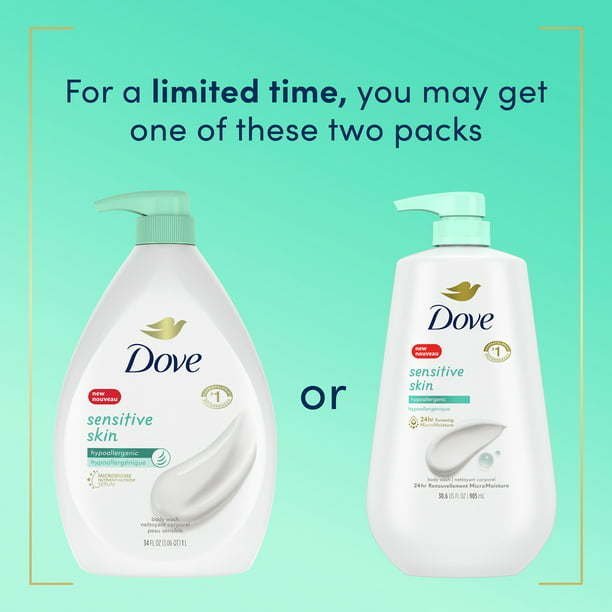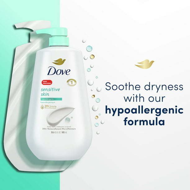 24hr renewing micromoisture: dove hypoallergenic sensitive skin body wash gently cleanses and nourishes the skin, leaving it renewed and healthy-looking for 24 hours.