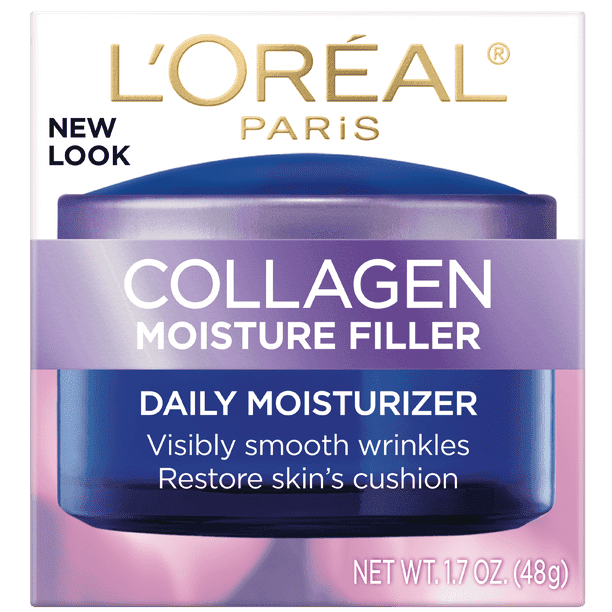 L'Oreal Paris Collagen Moisture Filler Day Night Cream; A dose of intense hydration and natural Collagen in Collagen Filler Moisture Day Lotion and Day/Night Cream is essential for younger-looking skin. Rich moisture instantly restores skin's cushion and bounce. Over time; the powerful natural Collagen helps fill in lines and wrinkles; leaving your skin smooth and plump. Use it for a complete collagen-infused skincare regimen. In just 4 weeks 78% of women saw filled in wrinkles.