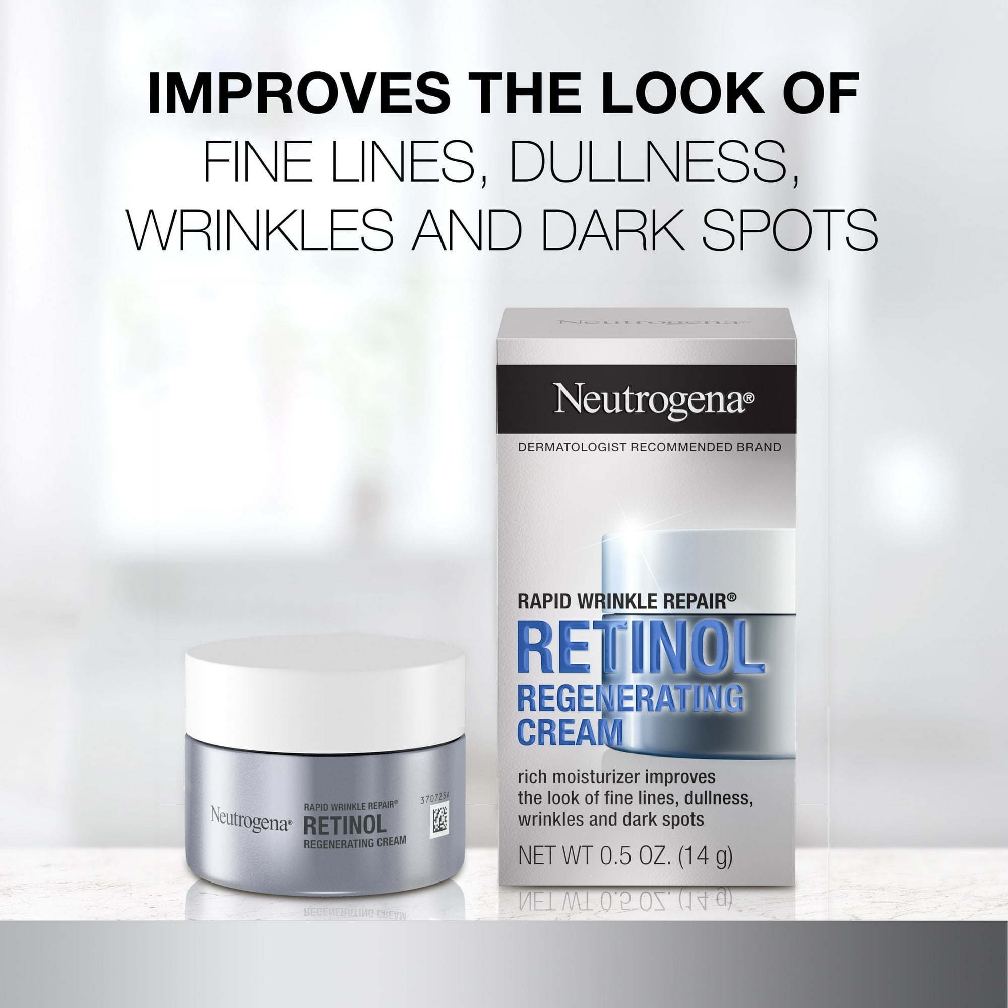 Neutrogena Rapid Wrinkle Repair Retinol Regenerating Cream delivers our uniquely stabilized retinol deep within skin's surface to quickly fight the signs of aging & regenerate the look of skin. The deep moisturizing face cream helps improve the look of fine lines, dullness, wrinkles & dark spots. Contains retinol, a dermatologist-proven form of vitamin A & powerful ingredient that fights fine lines, dullness, wrinkles & dark spots, & hyaluronic acid, which adds plumping moisture to help hydrate & rejuvenate the look of skin. Instantly hydrates for smoother skin & smooths the look of fine lines & reduces the look of dark spots in just one week. Regenerating Retinol Cream is suitable for daily use & is formulated without parabens, mineral oil & dyes.