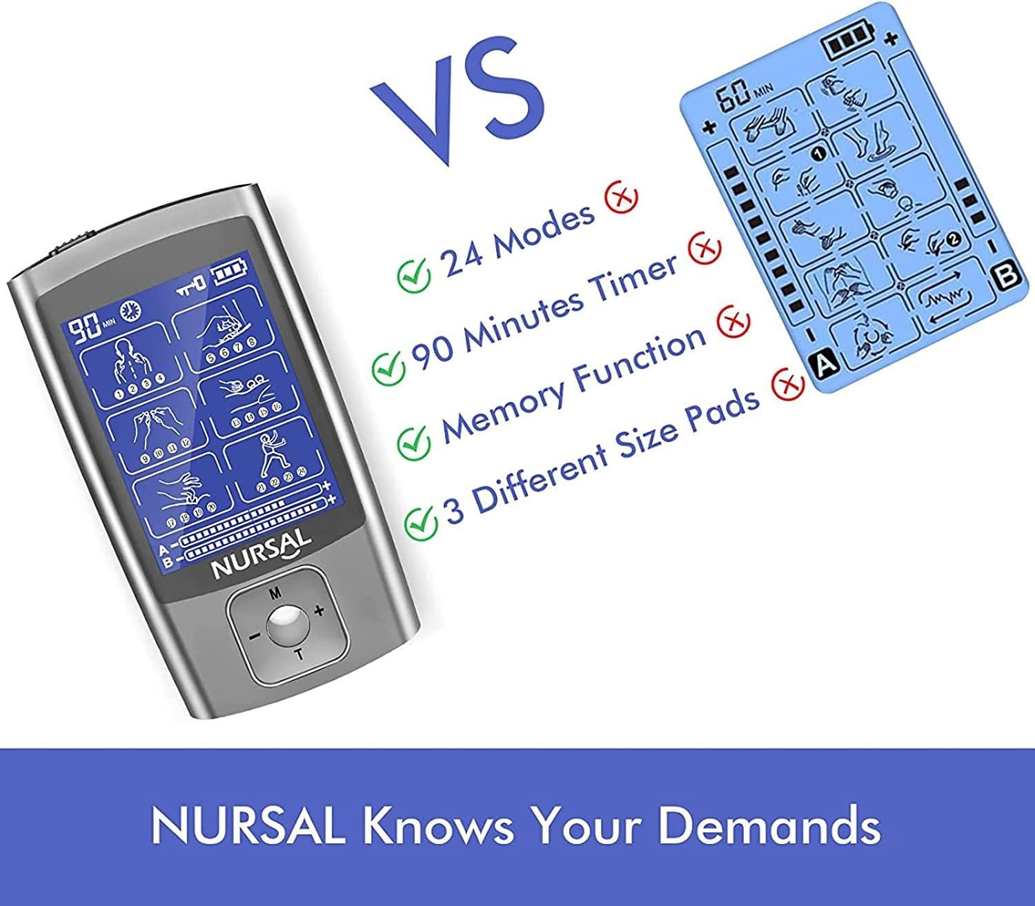 Transcutaneous Electrical Nerve Stimulation; or TENS; is a non-invasive; drug-free pain relief method not a cure for any physiological ailment. It uses small electrical impulses sent through the skin to stimulate the nerves in the an affected area of the body to modify your pain perception. For most users; TENS unit is very effective in reducing; or eliminating pain; allowing for a return to normal; everyday activity. | Electrical Muscle Stimulation helps by increasing blood flow to muscles; increasing range of motion; increasing muscle strength; as well as enhancing muscle endurance. Muscle Stimulators have pain management attributes in helping muscle-related pain; such as spastic muscle; sore muscles; or tight muscles. | Constant Pulse Massage Modes can steadily output current and reduce the stimulation caused by pulse instability. This ensures the elderly or sensitive people will enjoy the NURSAL Tens unit. |