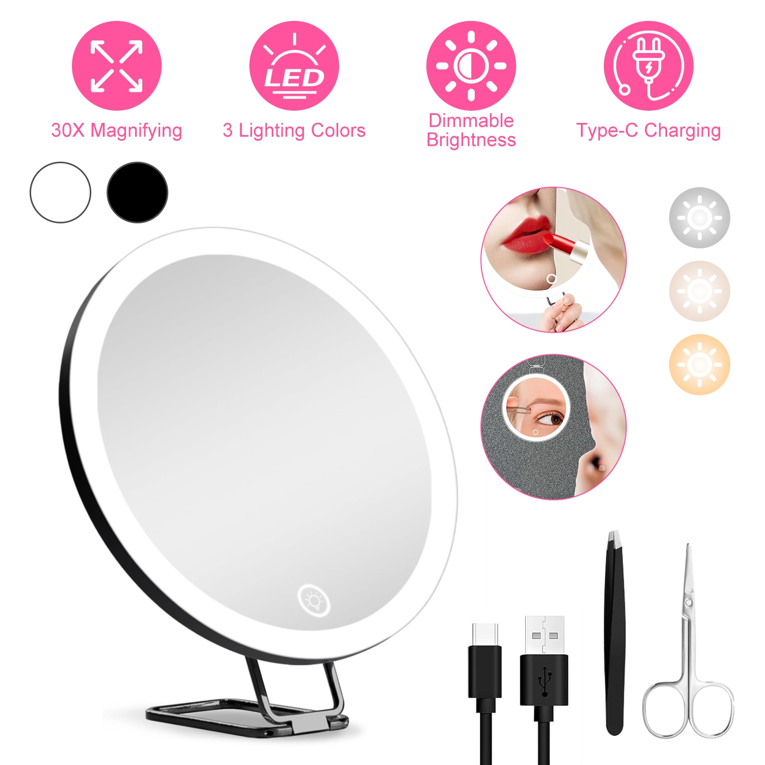 30X Magnifying Mirror With Light 3 Colors Dimmable Brightness Included Tweezer Scissor