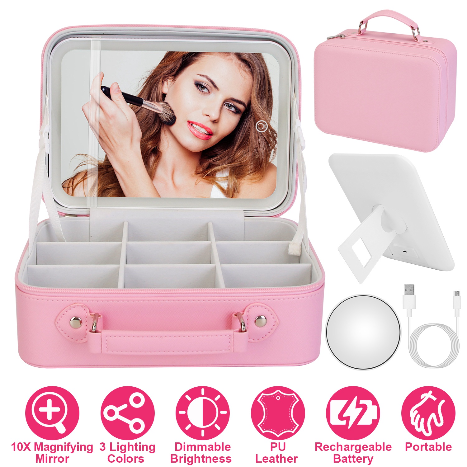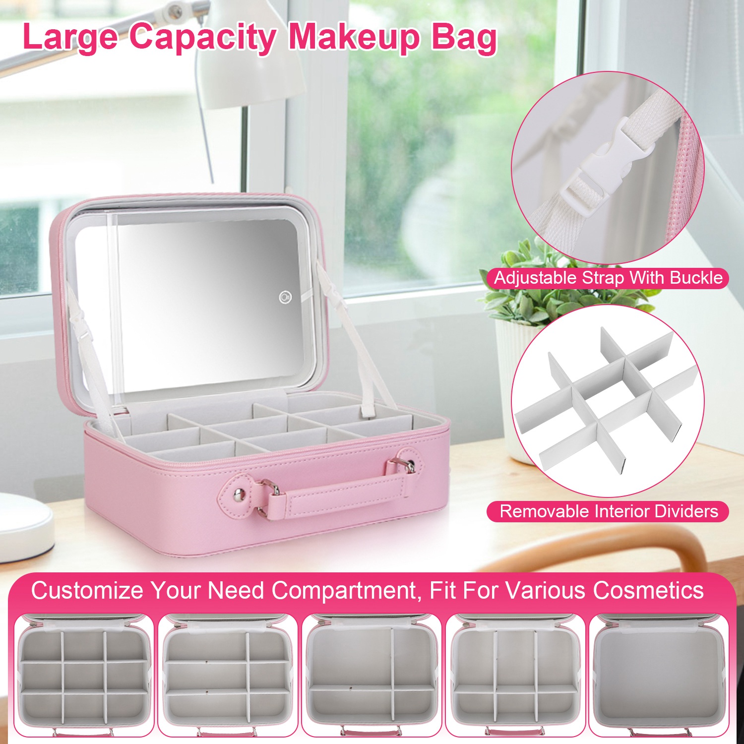 Travel Makeup Bag With 3 Light Colors Dimmable Brightness LED Mirror Detachable 10X Magnifying Mirror Adjustable Dividers Portable Waterproof Cosmetic