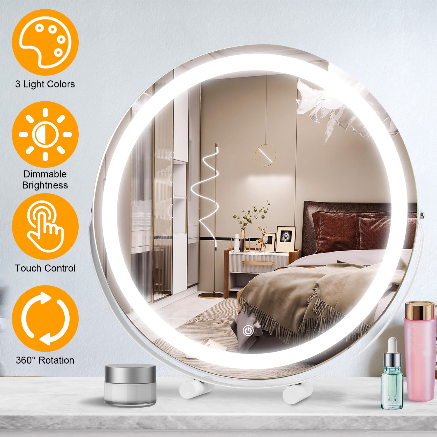 19Inch Large Round Vanity Makeup Mirror With LED Halo Light 3 Lighting Colors Dimmable Brightness Touch Control 360° Rotation High-Definition Lighted