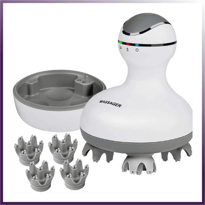 • WATERPROOF & SKIN-FRIENDLY: The electric head massager is made from IPX-7 Waterproof material, allowing you to use it during the shower for a proper scalp massage, relaxing thoroughly with 4-mode tension like a physical therapist. The eco-friendly soft silicone heads prevent hair from being pulled or tangled and do not hurt your skin, making it safe for all skin types. The massage nodes are detachable for easy cleaning.